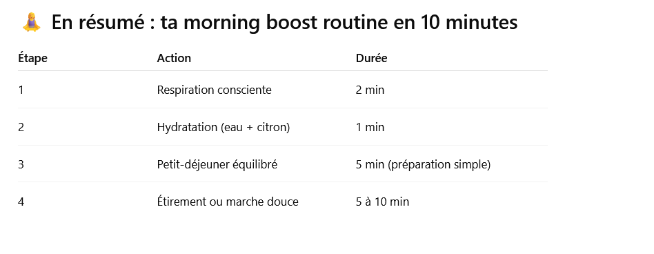 Tu te rĂ©veilles fatiguĂ©e malgrĂ© une nuit de sommeil complĂšte ? Avant de te jeter sur ton cafĂ© ou de courir aprĂšs le temps, prends un moment pour toi. Une routine matinale bien pensĂ©e peut transformer ta journĂ©e â et ton Ă©nergie â de façon durable et naturelle. Voici 4 piliers simples mais puissants : respiration, hydratation, petit-dĂ©jeuner et mouvement.